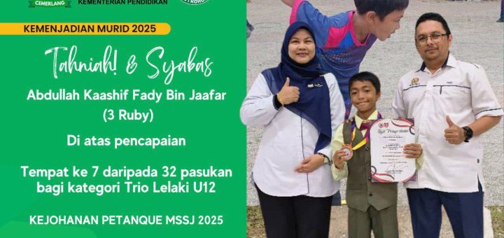 Tahniah & Syabas Abdullah Kaashif Fady Bin Jaafar (3 Ruby) Atas pencapaian Tempat ke 7 daripada 32 pasukan bagi kategori Trio Lelaki U12. KEJOHANAN PETANQUE MSSJ 2025 (Peringkat Negeri)