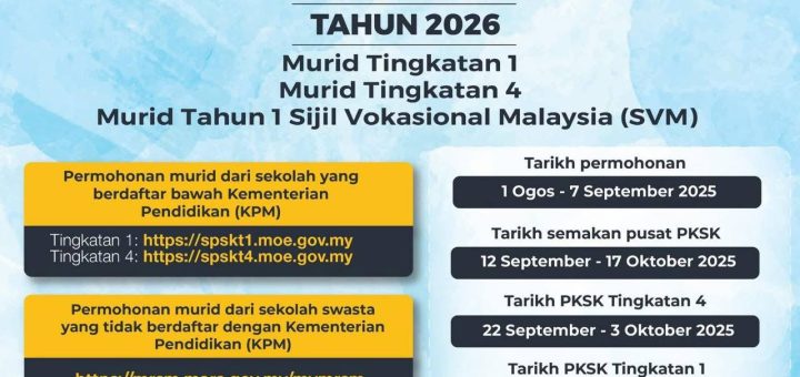 INFO KPM: Permohonan Kemasukan ke Sekolah Khusus dan Maktab Rendah Sains MARA (MRSM) Tahun 2026 kini dibuka bagi murid Tingkatan 1, Tingkatan 4 dan Tahun 1 Sijil Vokasional Malaysia (SVM). Permohonan boleh dibuat mulai...