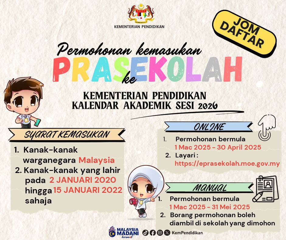 NFO KPM: Permohonan kemasukan Prasekolah Kementerian Pendidikan Kalendar Akademik Sesi 2026.