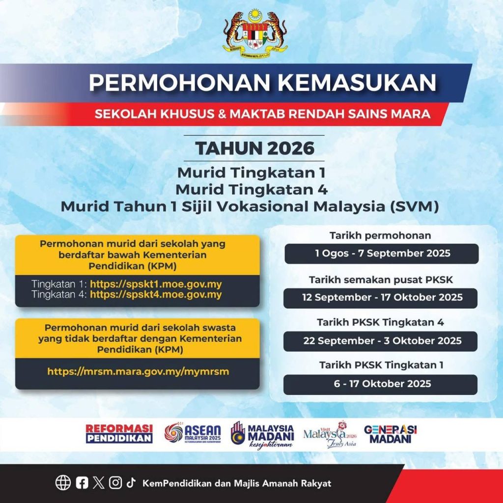 INFO KPM: Permohonan Kemasukan ke Sekolah Khusus dan Maktab Rendah Sains MARA (MRSM) Tahun 2026 kini dibuka bagi murid Tingkatan 1, Tingkatan 4 dan Tahun 1 Sijil Vokasional Malaysia (SVM).