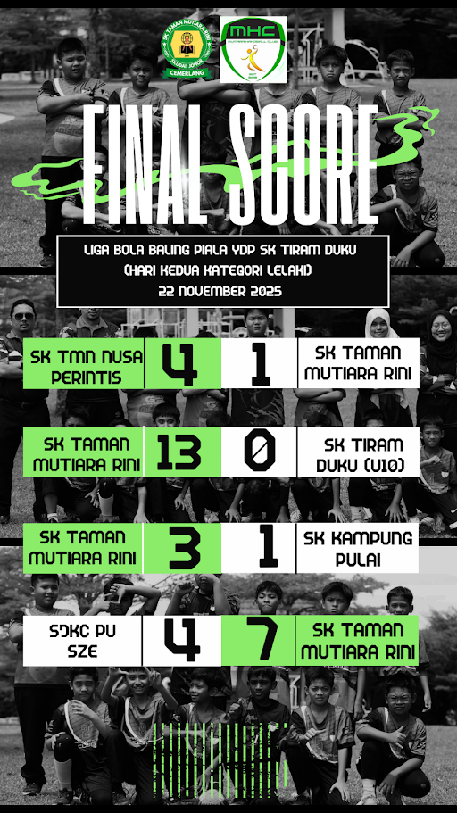 NUSANTARA, 22 NOVEMBER 2025 β Pasukan bola baling lelaki bawah 11 tahun Sekolah Kebangsaan (SK) Taman Mutiara Rini (SKTMR) mempamerkan prestasi yang mengagumkan dengan mencatatkan keputusan cemerlang dalam sesi pertemuan kedua Liga Bola Baling Bawah 11 Tahun Piala YDP SK Tiram Duku.