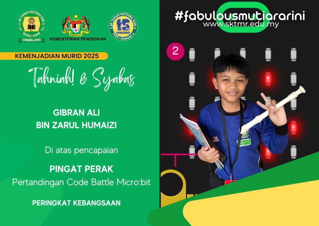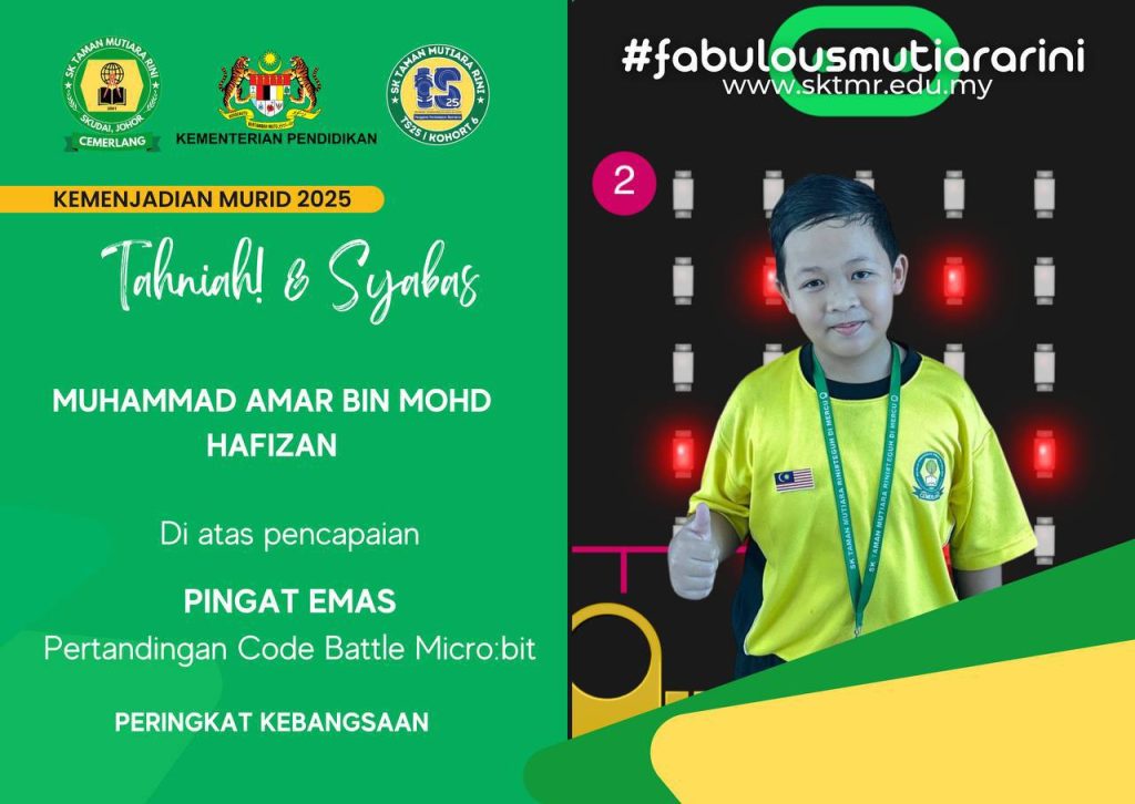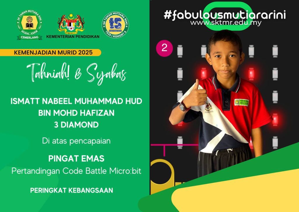- Ismatt Nabeel Muhammad Hud bin Mohd Hafizan dari kelas 3 Diamond, berjaya meraih PINGAT EMAS dalam Pertandingan Code Battle Micro:bit.